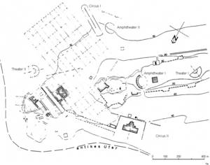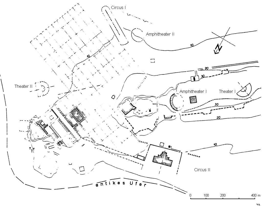 Utica, Stadtplan mit Verzeichnis der Theater, Amphitheater und Zirkusse (Plan: A. Lézine mit Bearbeitungen R. Gogräfe)