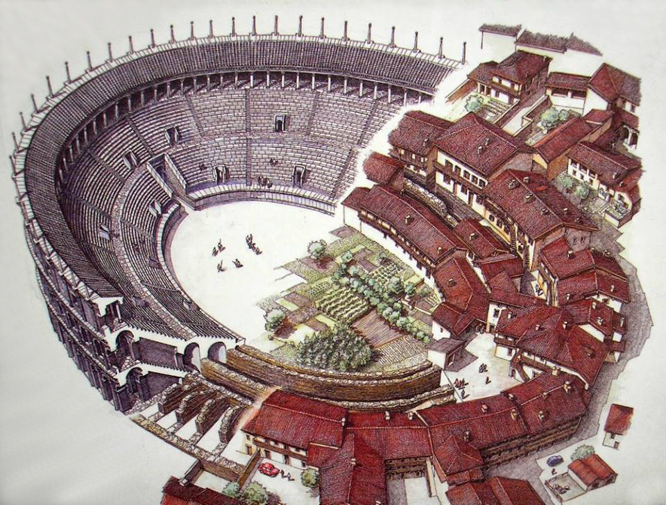 P. Pinon, Approche typologique des modes de réutilisation des amphithéâtres de la fin de l'Antiquité au XIXe siècle, in: C. Domergue - Chr. Landes - J.-P. Pailler (Hrsg.), Spectacula I, Gladiateurs et amphithéâtres, Actes du colloque tenu à Toulouse et à Lattes les 26, 27, 28 et 29 mai 1987 (Lattes 1990) 103-127 Abb. 23.
