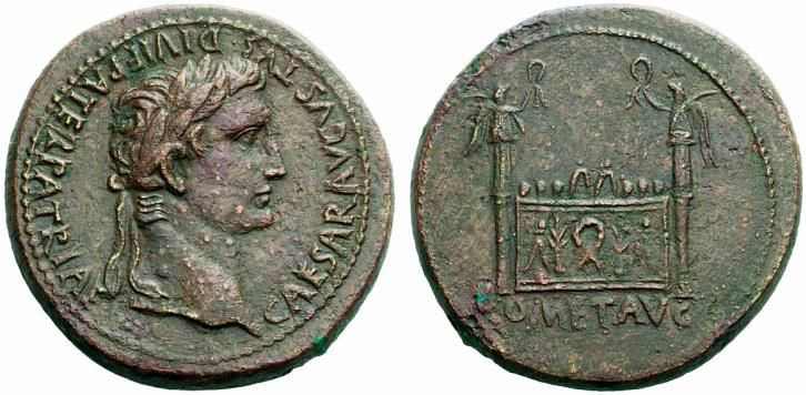 - Sesterz, geprägt 9-14 n. Chr. in Lugdunum. Vs.: CAESAR AVGVSTVS DIVI F PATER PATRIAE, Augustus mit belorbeertem Kopf nach rechts. Rs.: ROM ET AVG (im Abschnitt), Altar von Lyon, verziert mit Eichenkranz zwei Lorbeerzweigen und zwei stilisierten, männlichen Figuren; rechts und links davon eine Säulen mit einander anschauenden, kranzhaltenden Victorien. RIC² 231a (S); BMC 565.