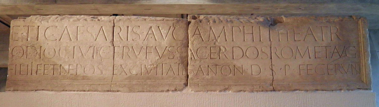 „Für das Heil des Tiberius Cäsar Augustus haben das Amphitheater (mit einem Podium?) C. Iulius Rufus, der Sohn des Caius, Priester der Roma und des Augustus (und?) der Sohn seines Sohnes sowie sein Enkel aus der civitas der Santonen aus eigenem Geld erbauen lassen.”