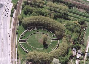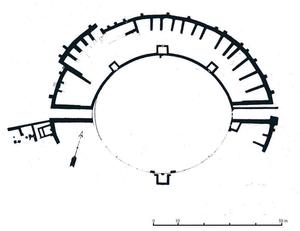 Militärstadt erbauten. Das Gebiet wurde ehemals Schneckenberg genannt. In der Längsachse befinden sich die Eingänge zur Arena, in der Querachse liegen überwölbte Zugänge zu den unteren Sitzplätzen. Es fanden sich zahlreiche Sitzsteine mit den Namen der Platzinhaber.