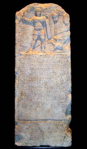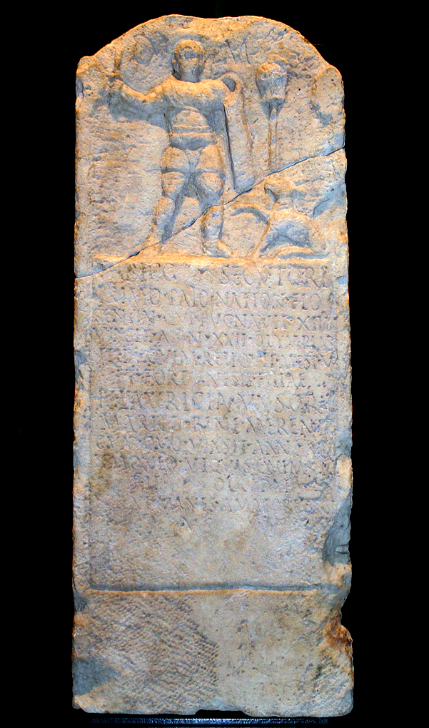 primus palus Urbicus aus Florenz, der 13 mal gekämpft und 22 Jahre gelebt hat, (haben) seine Tochter Olympias, die er im Alter von 5 Monaten zurückgelassen hat, seine Tochter Fortunensis und seine Frau Lauricia dem wohlverdienten Ehemann, mit dem sie 7 Jahre zusammengelebt hat (den Grabstein gesetzt). Und ich mahne, dass derjenige, der jemanden besiegt hat, ihn auch töten soll. Seine Anhänger ehren seine Manen."