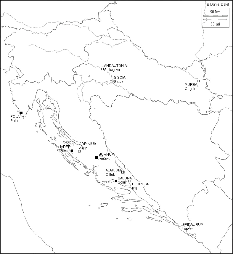 - Karte von Kroatien mit Angabe der Orte mit nachgewiesenem Amphitheater (■) und vermuteten Amphitheater (□) (Karte: D. Dalet; Bearbeitung: R. Gogräfe - M. Buovac).