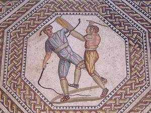 In dem fraglichen Bildfeld kämpfen zwei ungepanzerte Gladiatoren gegeneinander. Ihre Kleidung erinnert eher an diejenige von Wagenfahrern als den üblichen Gladiatoren. Der linke kämpft mit einer Peitsche in der Rechten und einem Pedum-artigen Knüppel in der Rechten, wo er außerdem mit einer brettartigen Bandage am Unterarm geschützt ist. Der rechte Gladiator führt den Knüppel in der Linken, in der Rechten sieht man den Griff der Peitsche, außerdem ist seine linke Schulter mit Schutz versehen, der an den galerus der Retiarier erinnert.