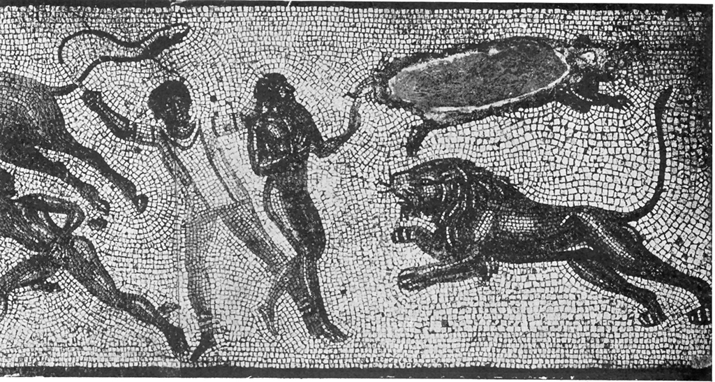 oben), in der Mitte ein nackter Gefangener, der von einem Aufseher mit der Peitsche gezwungen wird, sich einem anstürmendem Löwen und einem Stier auszuliefern.