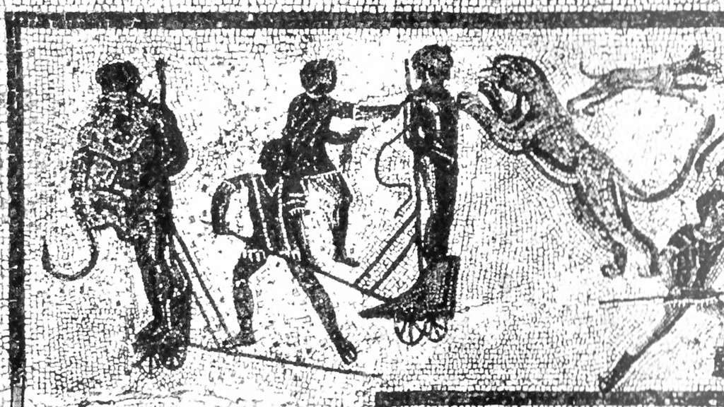 Seite D des Gladiatorenmosaiks aus Zliten sind drei ad bestias Verurteilte sichtbar: links, zu Beginn des Streifens zwei auf einem fahrbaren Untersatz gefesselte Männer, die von Leoparden angefallen werden (