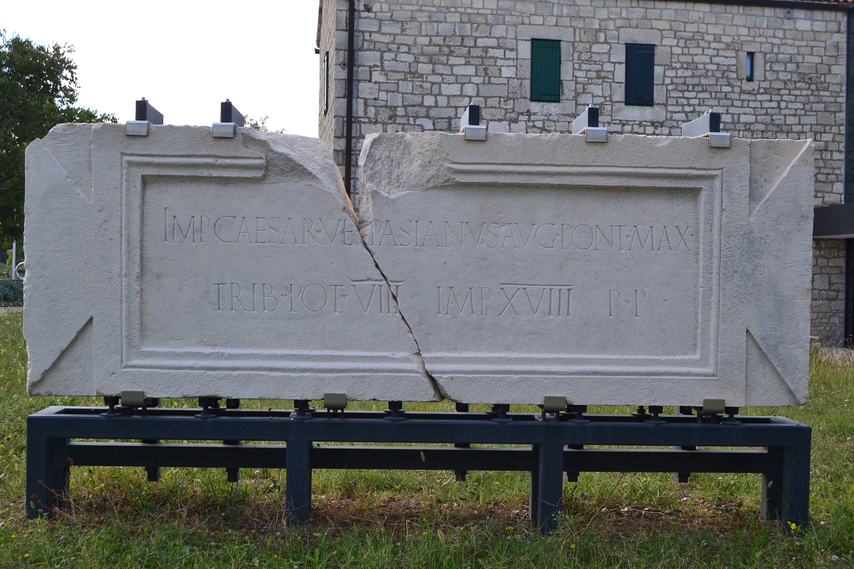 Vespasian Augustus, Oberpriester, zum siebten Male mit der tribunizischen Macht ausgestattet, zum 18. Male mit der imperatorischen Akklamation versehen, Vater des Vaterlandes.”