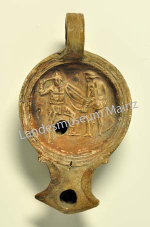 Literatur: A. Kirsch, Antike Lampen im Landesmuseum Mainz (Mainz 2002) 84 Kat.-Nr. 64; 176 Typ M 33 (thraex); Taf. 6.
