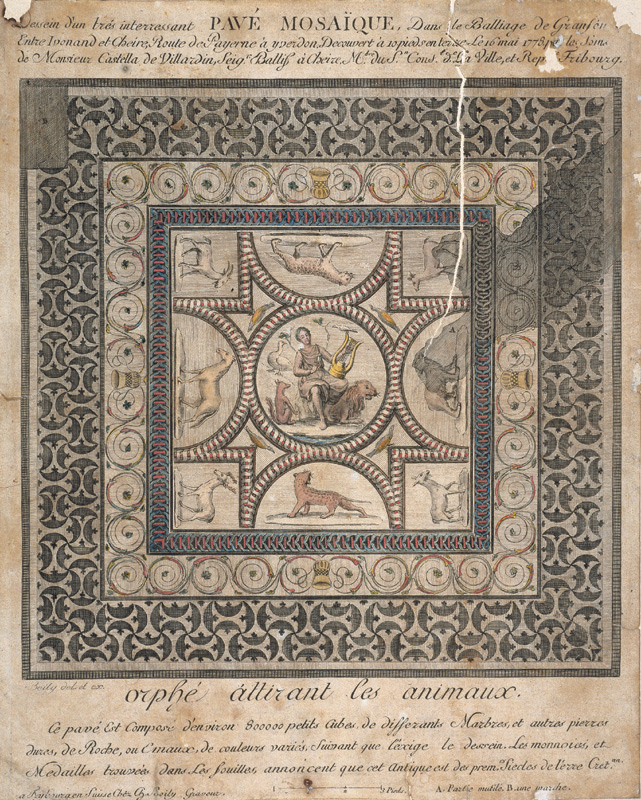 Literatur: E. Ritter, Antiquités de la Suisse (1786-1798) Blatt 24-25; V. von Gonzenbach, Drei Orpheusmosaiken aus der Waadt, Jahrbuch der Schweizerischen Gesellschaft für Urgeschichte 40, 1949/50, 273 ff. Taf. 38; dies., Die römischen Mosaiken der Schweiz, Monographien zur Ur- und Frühgeschichte der Schweiz 13 (Basel 1961) 235 f. Taf. 39; M. Ruetz - M. Müller, Mit Goethe in der Schweiz (Zürich/München 1979) 59 Abb.; I.J.Jesnick, The Image of Orpheus in Roman Mosaic - An Exploration of the Figure of Orpheus in Graeco-Roman Art and Culture with Special Reference to ist Expression in the Medium of Mosaic in Late Antiquity. BAR Int. Ser. 671 (Oxford 1997) 137 Nr. 53;